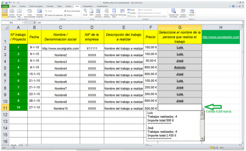 En la plantilla al seleccionar la celda de validación de datos (tenemos que seleccionar un nombre y no otro dato), ya que aparecen los trabajos realizados y el importe de los mismos.
